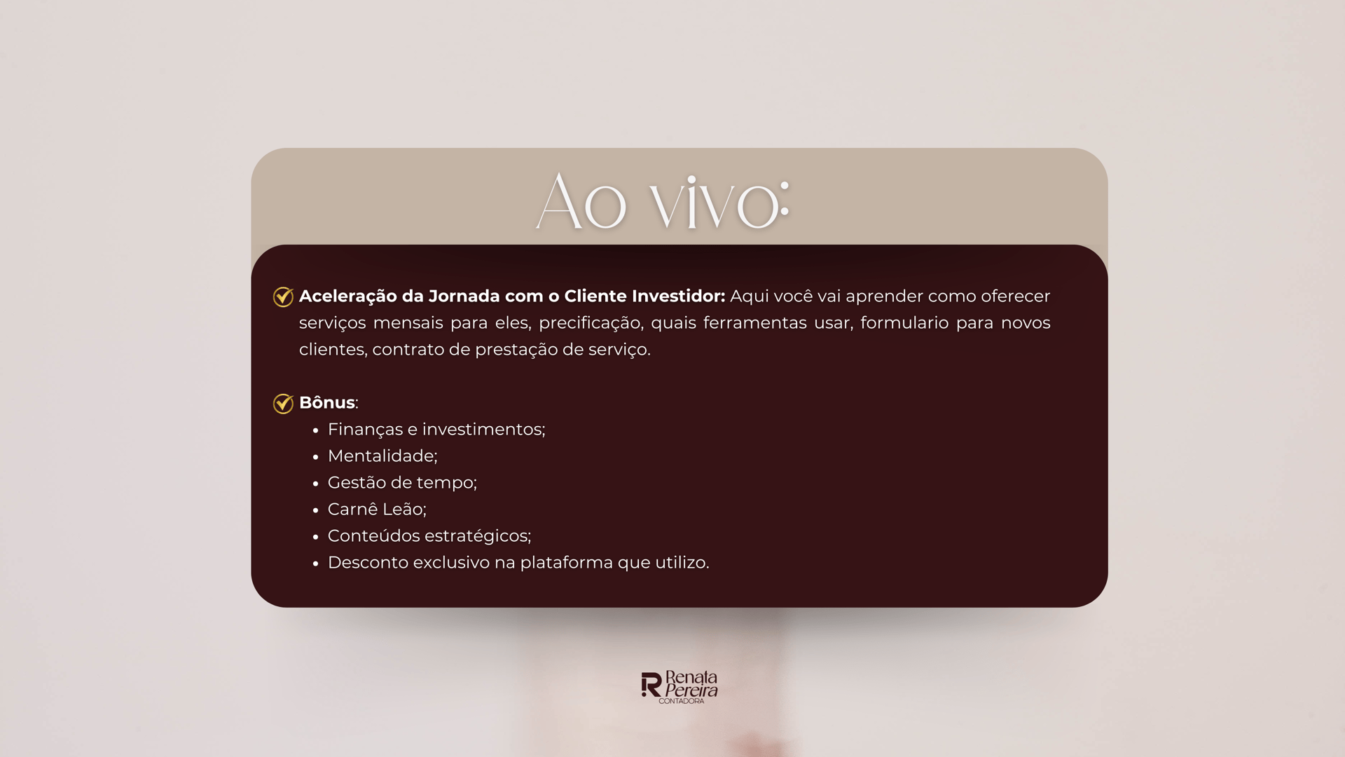 Será um período de acelerar os resultados dentro de 3 meses com foco no IRPF do ano que vem. A mentoria será de forma hibrida, onde será parte gravada e parte online em grupo.